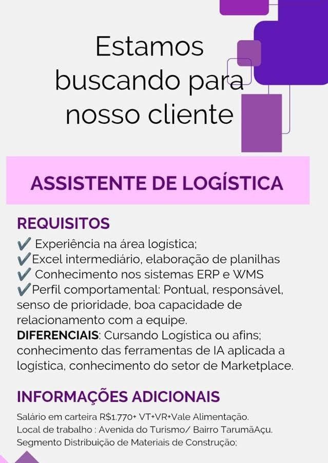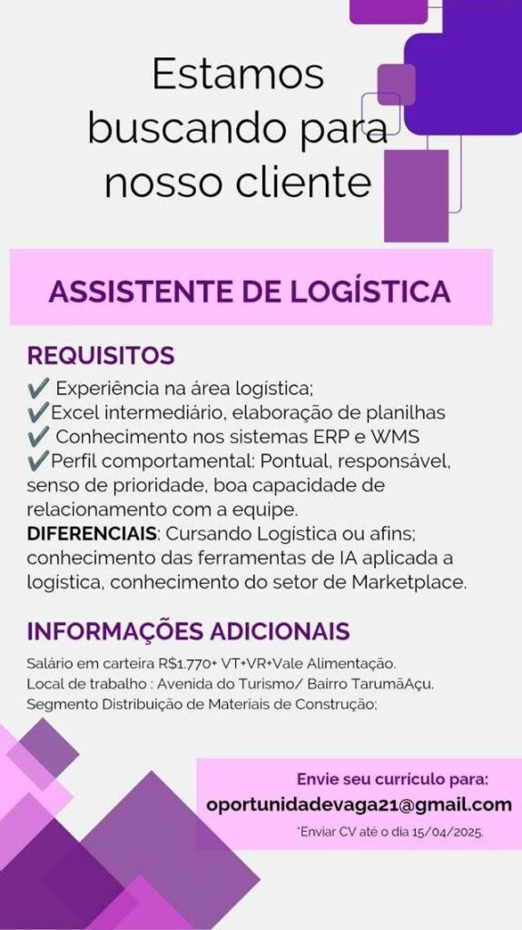 Empresa está selecionando Auxiliar Assistente de logística; Envie seu currículo!