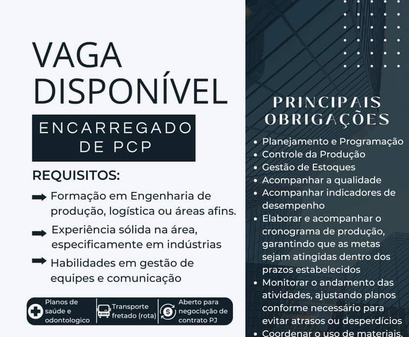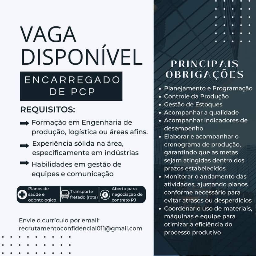 Empresa está selecionando Encarregado de pcp; Envie seu currículo!
