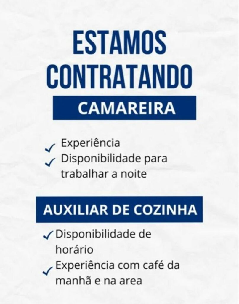 Empresa está selecionando Camareira, Auxiliar de cozinha; Envie seu currículo!