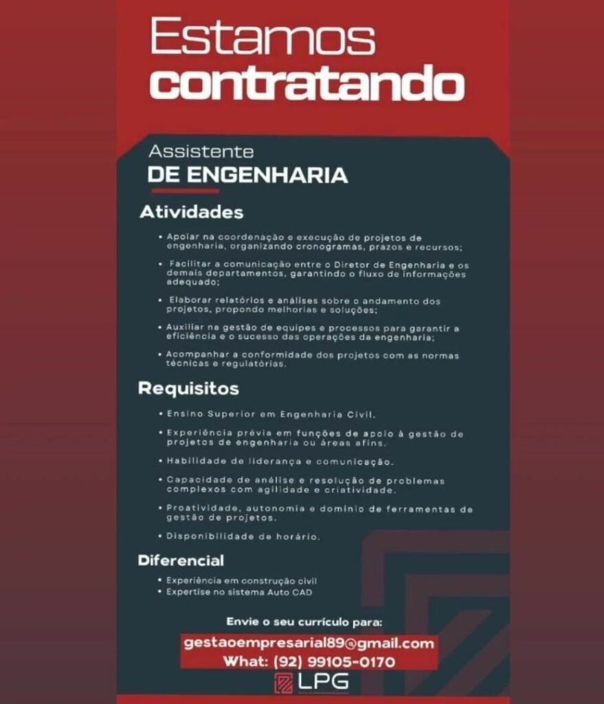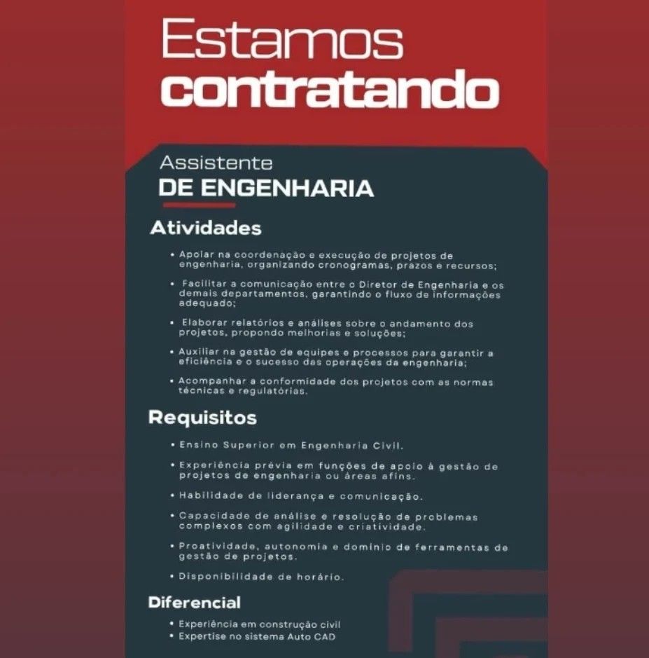 Empresa está selecionando Assistente de Engenharia; Envie seu currículo!