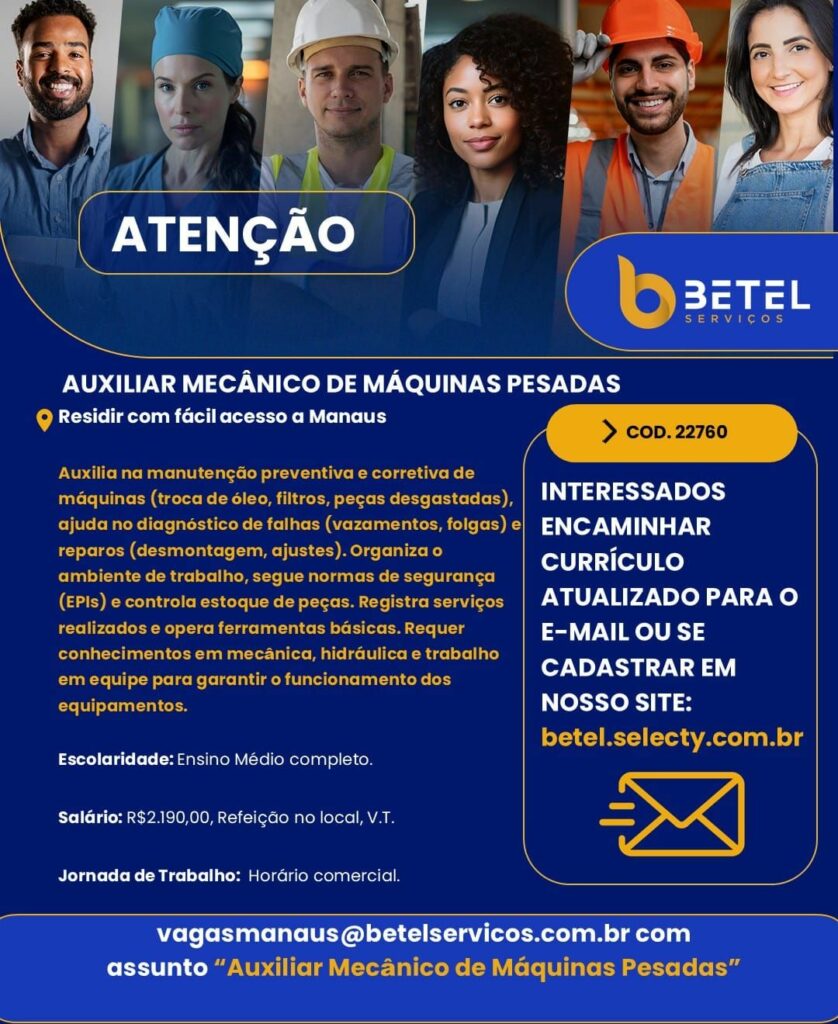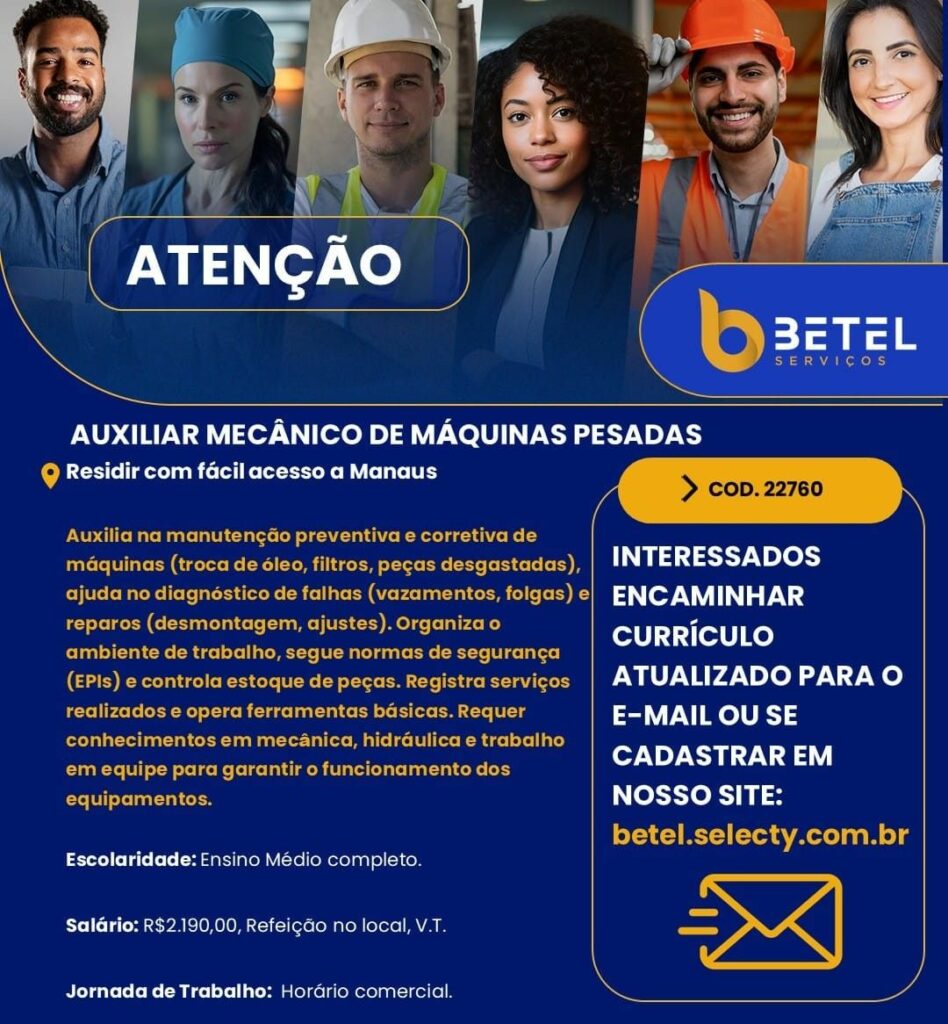 Rh está selecionando Auxiliar mecânico de máquinas pesadas; Envie seu currículo!