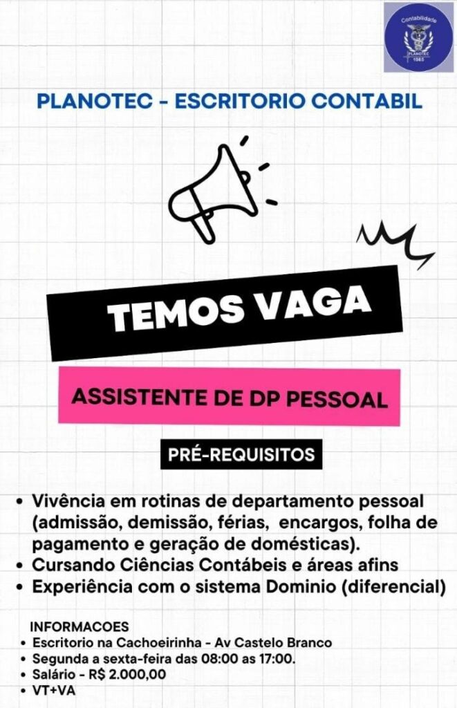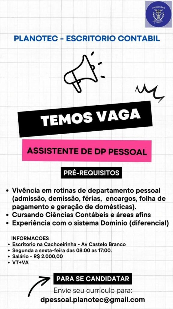 Escritório contábil seleciona Assistente de DP pessoal; Envie seu currículo!