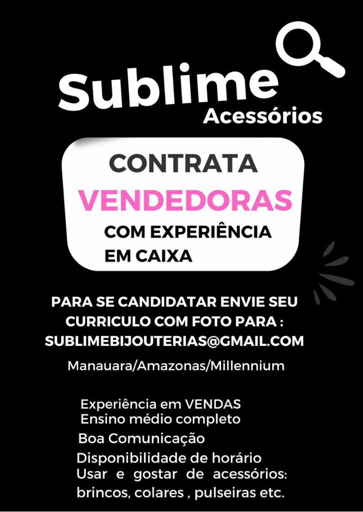 Sublime acessórios seleciona Vendedoras; Envie seu currículo!