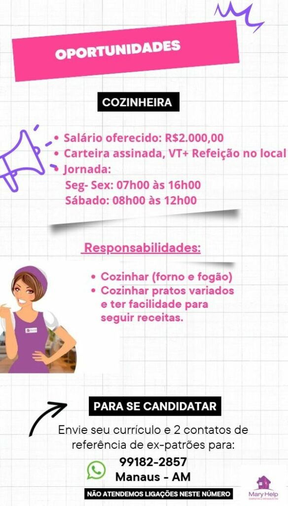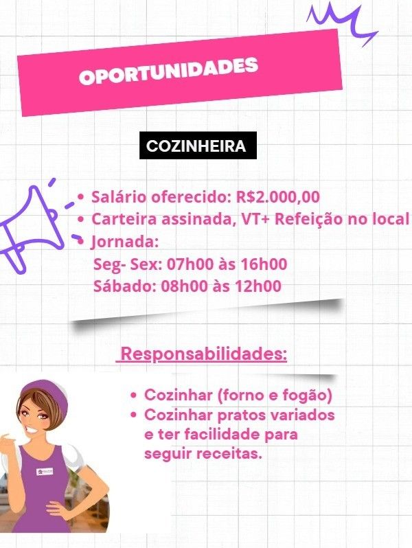 Empresa seleciona para vaga de Cozinheira; Envie seu currículo!