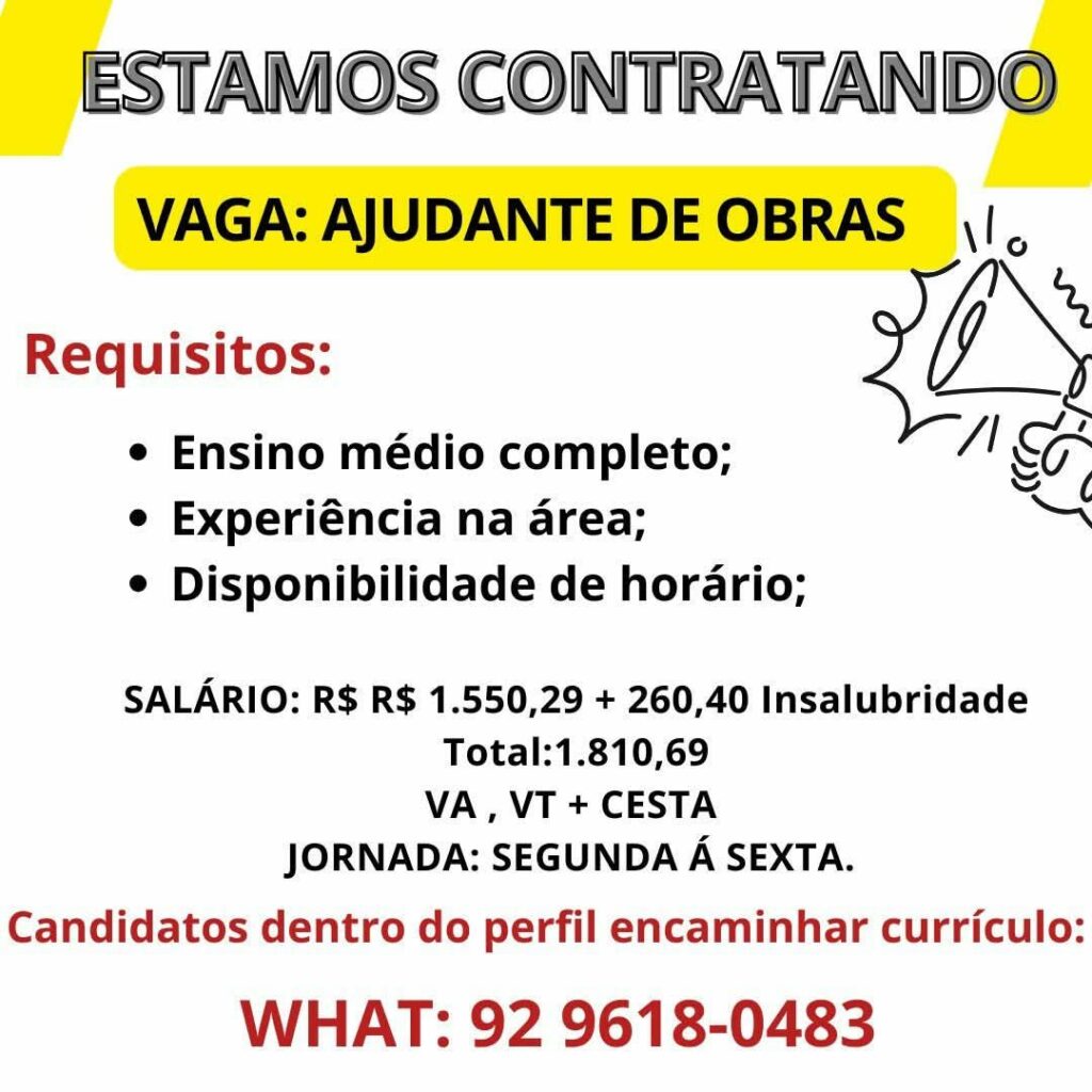 Empresa está selecionando Ajudante de obras; Envie seu currículo!