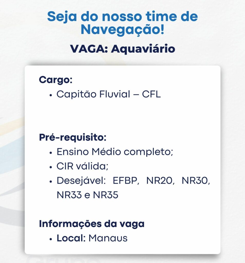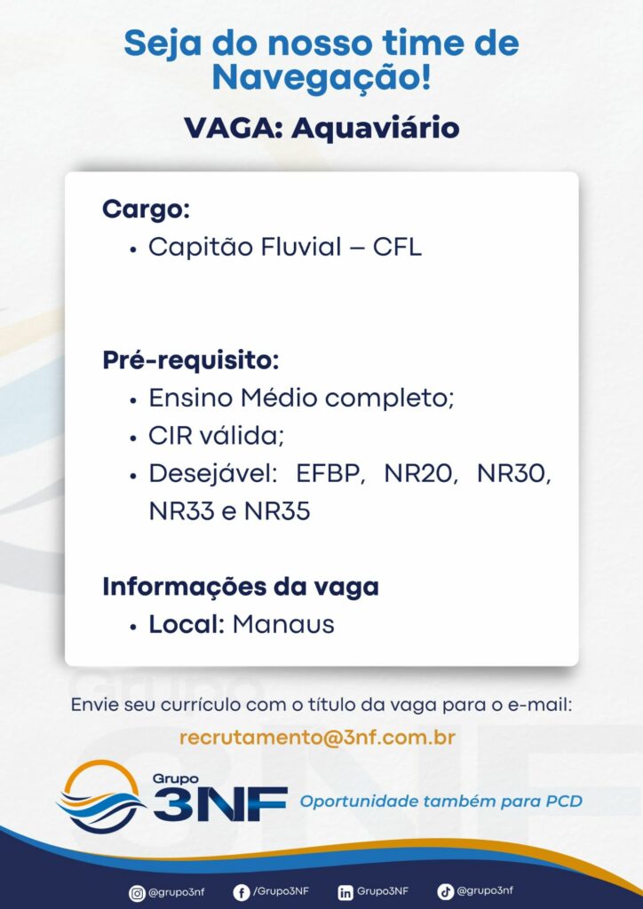 Grupo 3NF está selecionando Capitão fluvial; Envie seu currículo!