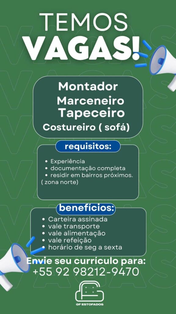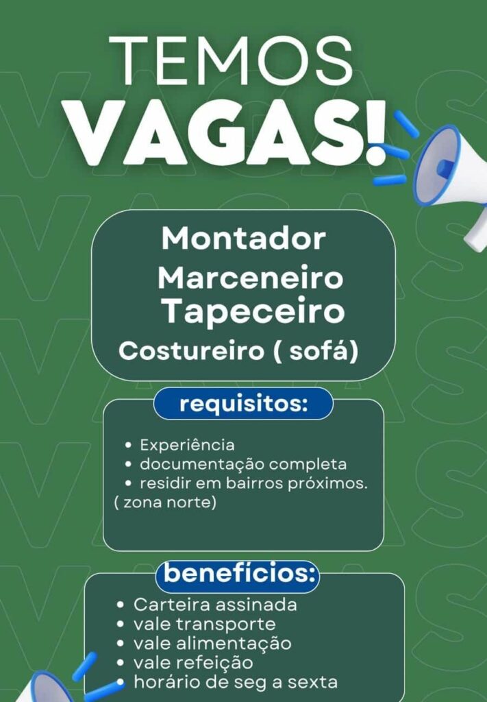 Seleção para seguintes vagas Montador, Marceneiro, Tapeceiro; Envie seu currículo!
