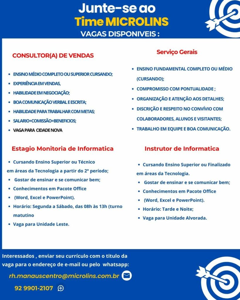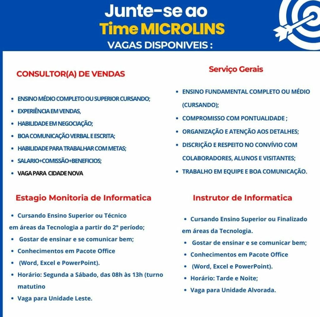 Microlins seleciona Consultor (a) de vendas, Serviço gerais, Instrutor de informática, Estágio monitoria de informática; Envie seu currículo!