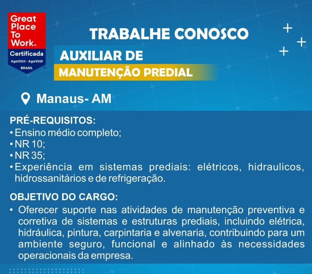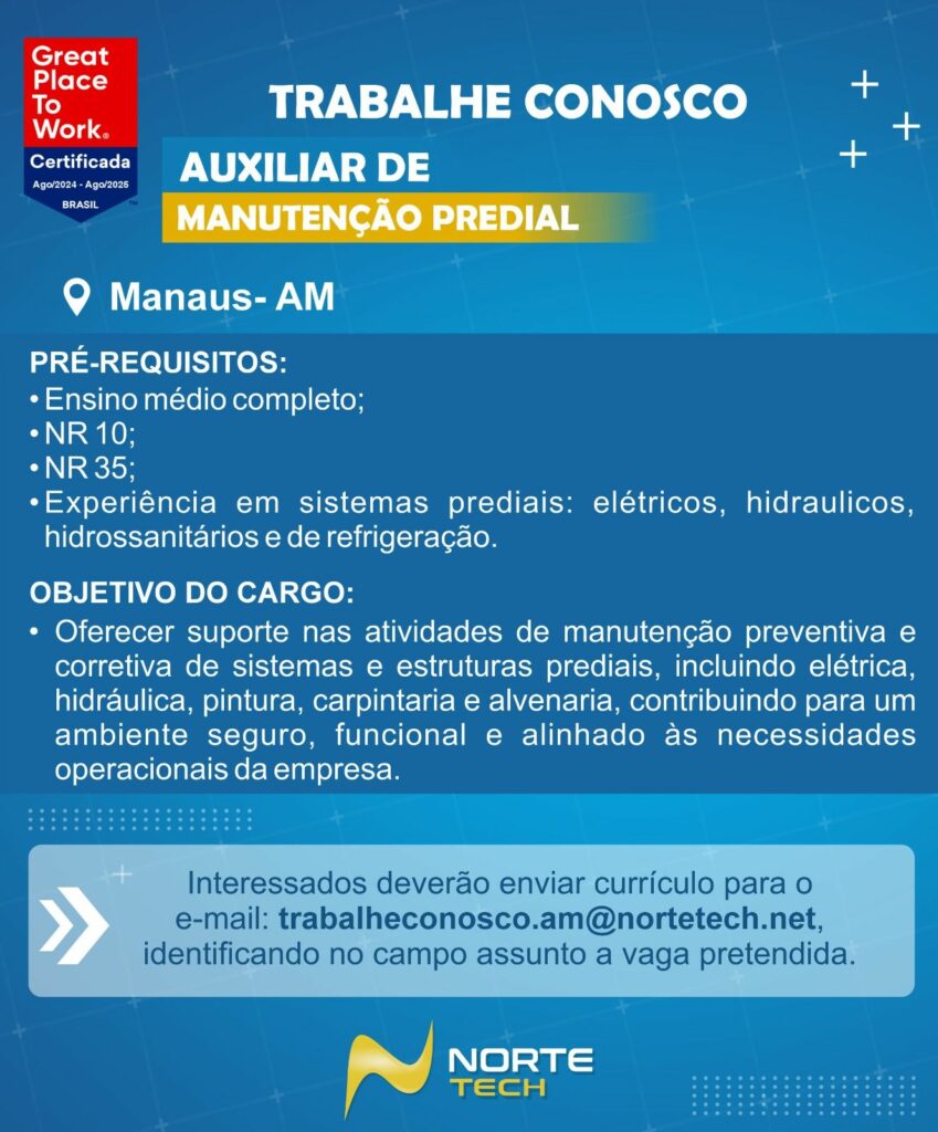 Empresa Norte Tech está selecionando Auxiliar de Manuntenção predial; Envie seu currículo!