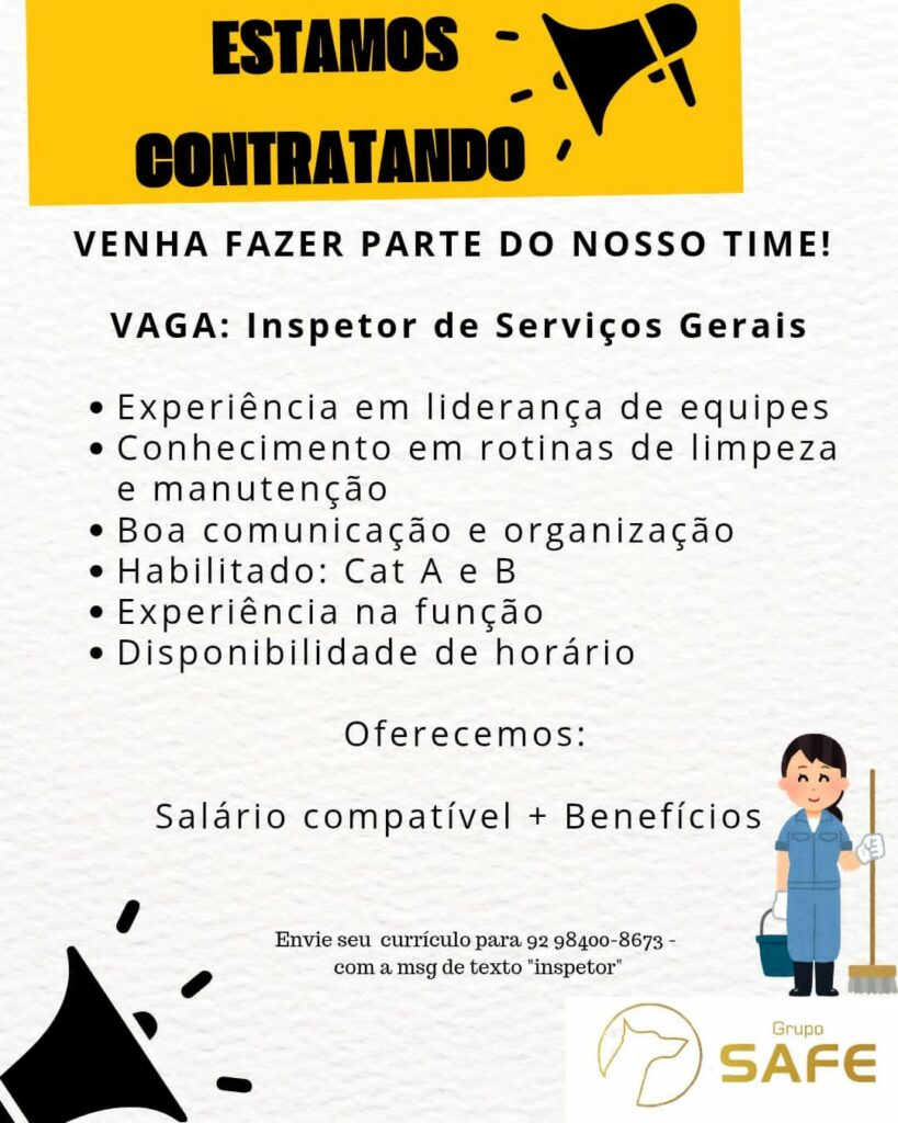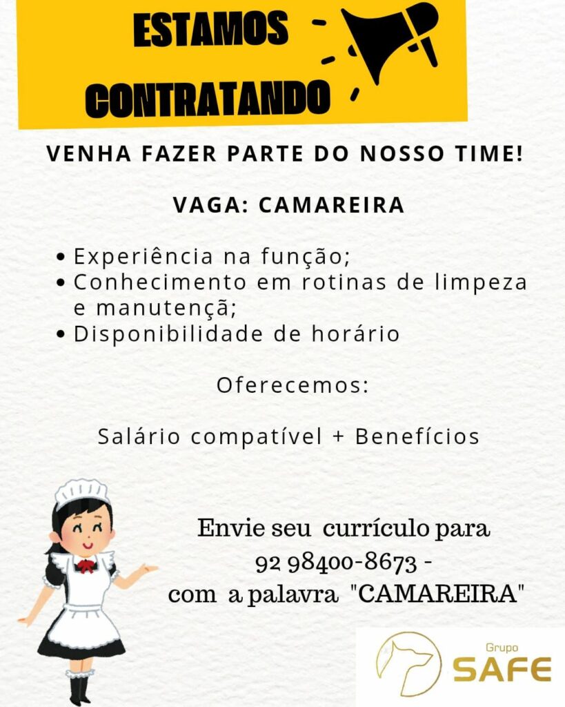 Grupo Safe está selecionando Inspetor de serviços gerais, Camareira; Envie seu currículo!