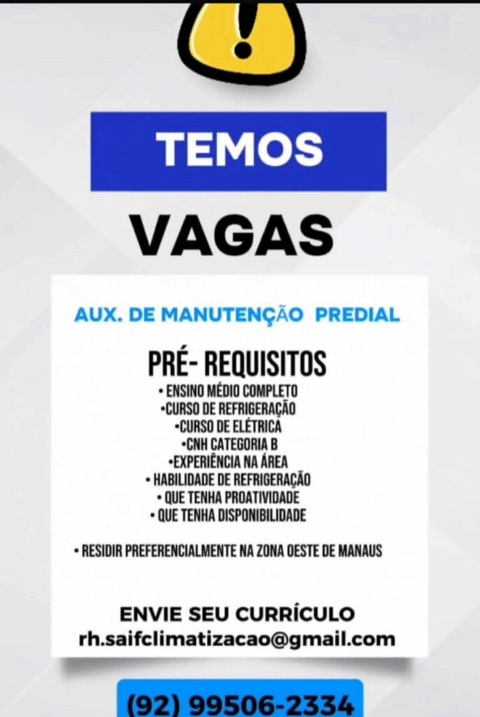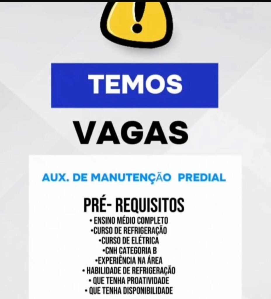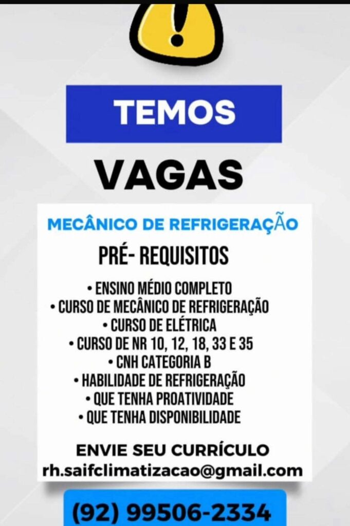 Empresa está selecionando está selecionando Mecânico de refrigeração, Auxiliar de manutenção predial; Envie seu currículo!