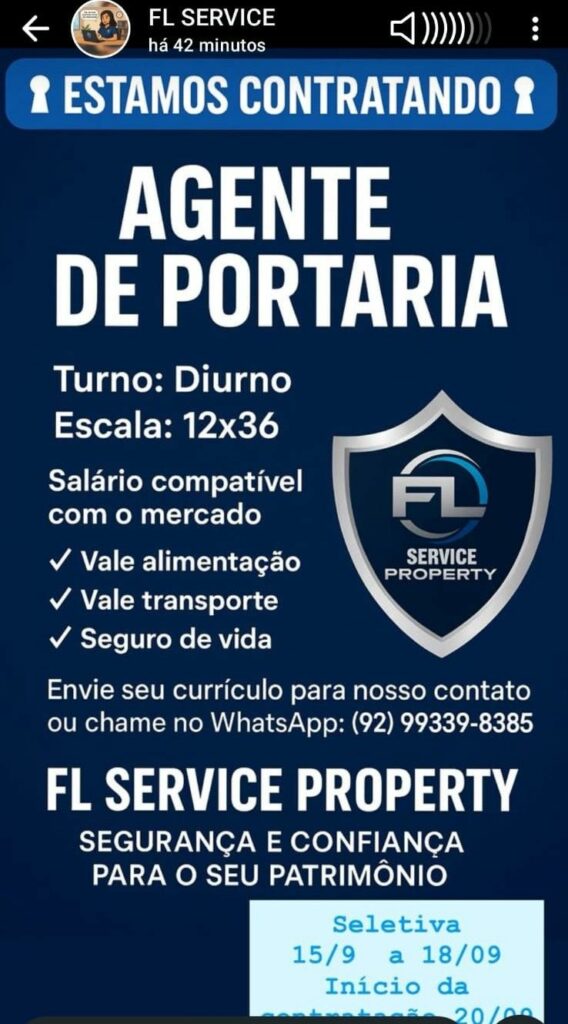 Empresa está selecionando Agente de portaria; Envie seu currículo!