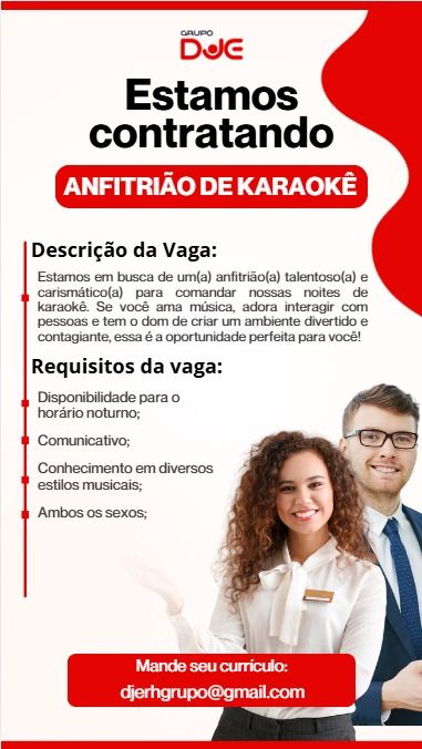 Grupo DJE está selecionando Anfitrião de Karaokê, ASG, Chefe de pista, Atendente; Envie seu currículo!