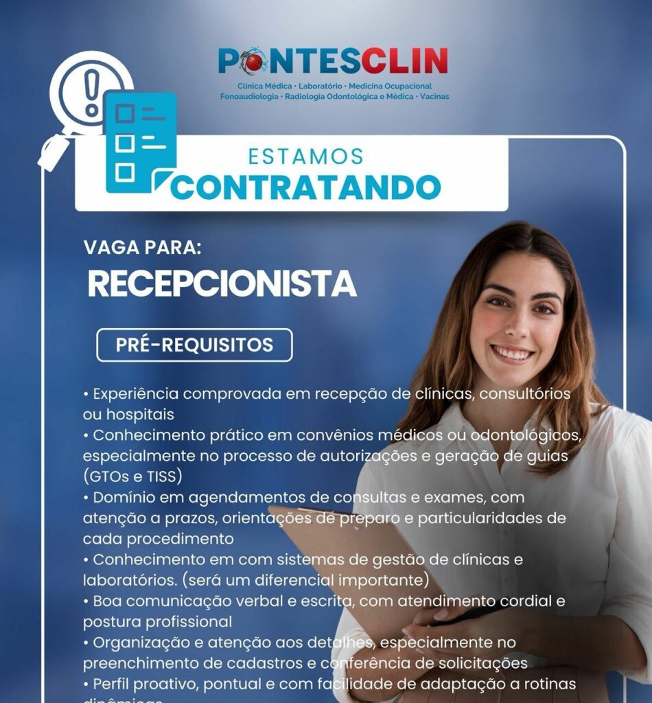 Pontesclin clínica está selecionando Recepcionista; Envie seu currículo!