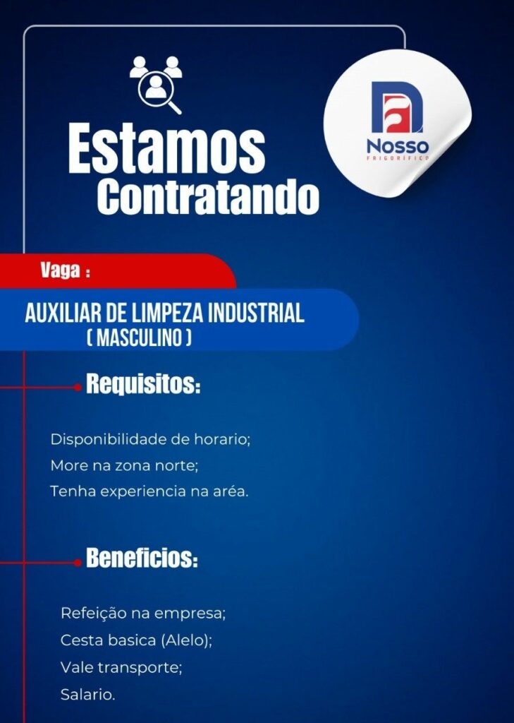 Rh está selecionando Auxiliar de limpeza industrial; Envie seu currículo!