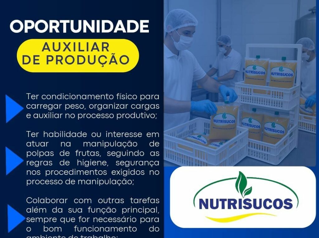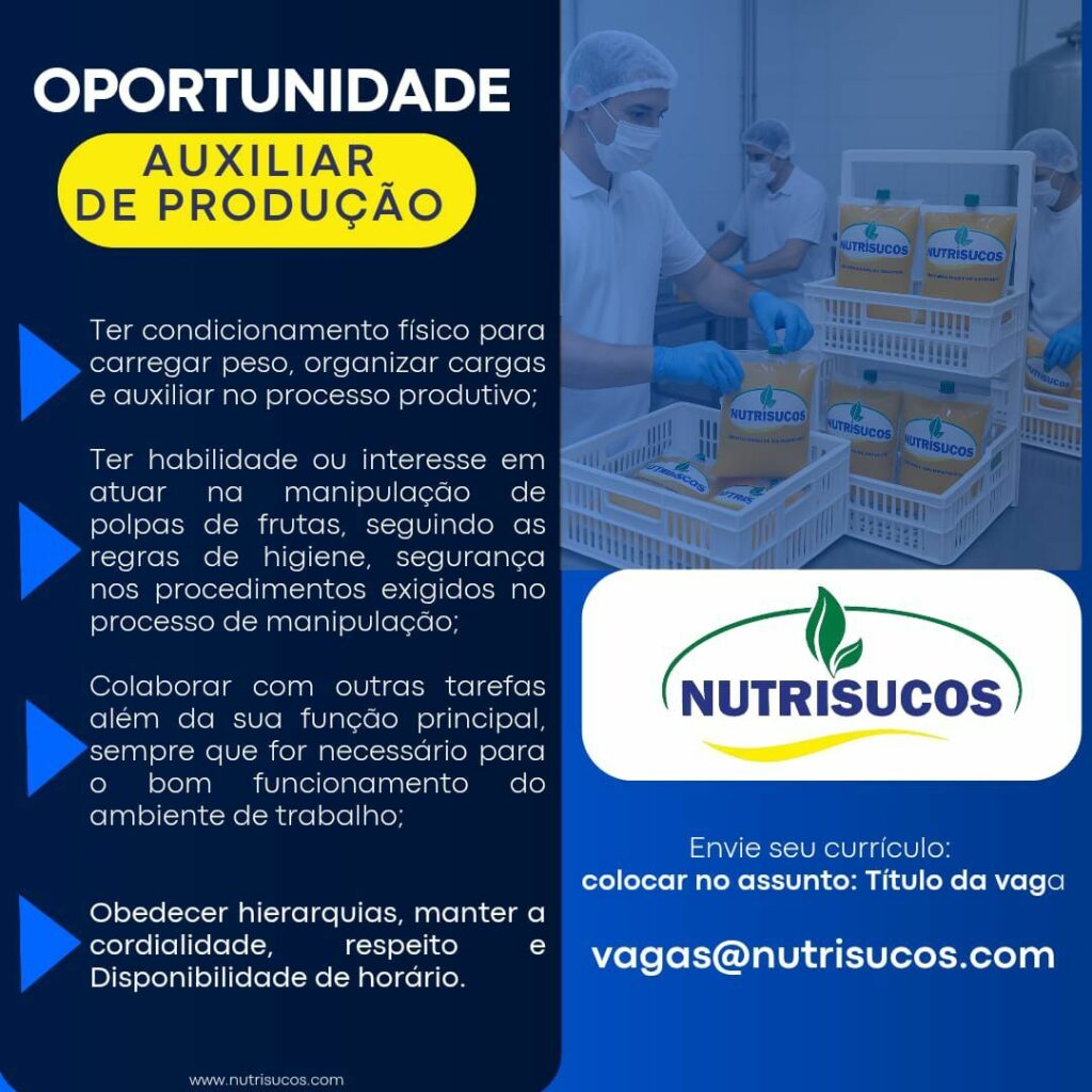Nutrisucos está selecionando Auxiliar de produção; Envie seu currículo!