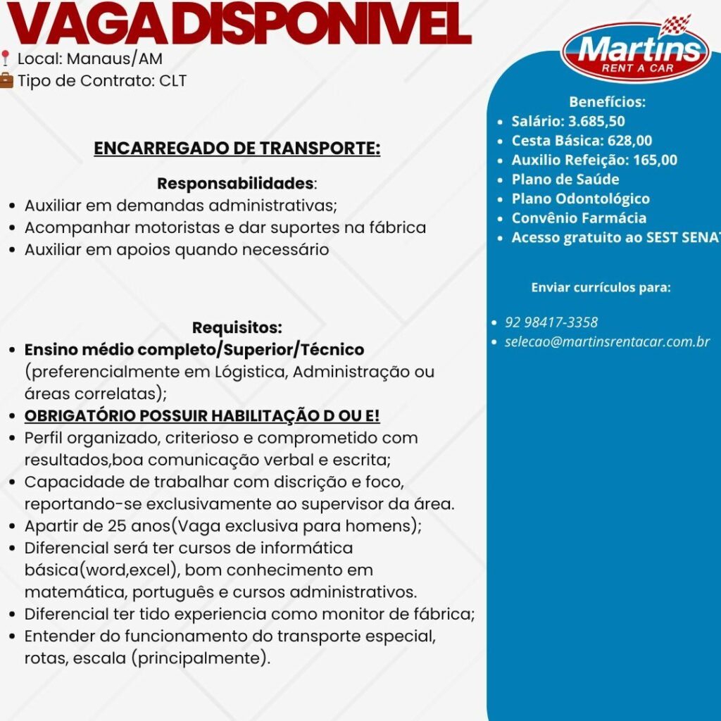 Martins rent a car seleciona Encarregado de transporte; Envie seu currículo!