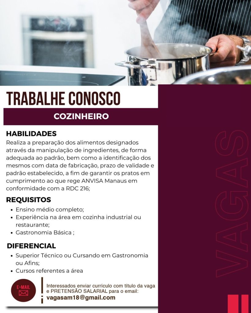 Empresa está selecionando Cozinheiro; Envie seu currículo!
