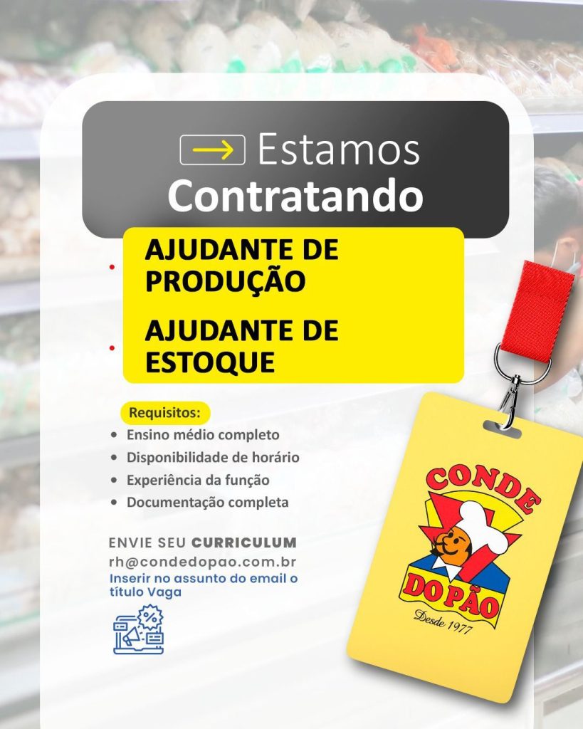 Conde do pão está selecionando Ajudante de produção, Ajudante de estoque; Envie seu currículo!