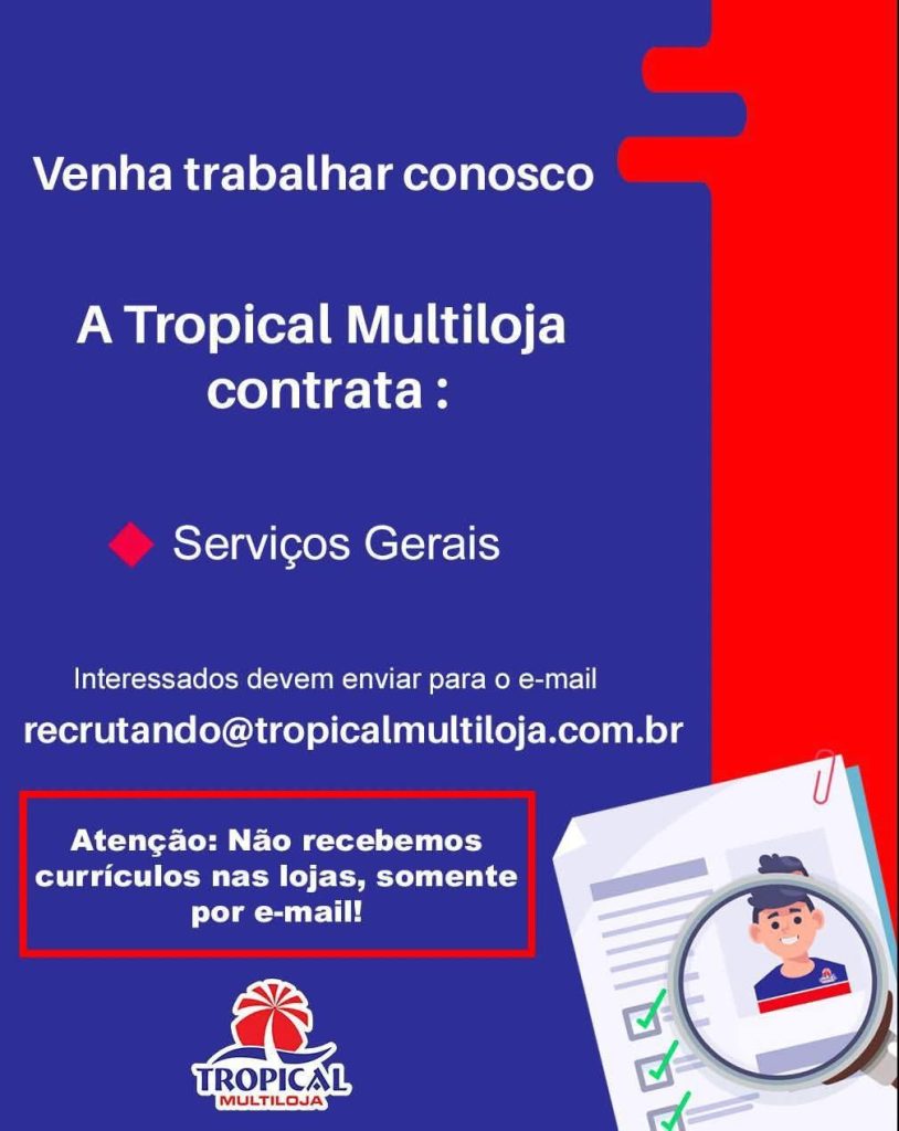 Tropical Multiloja está selecionando Serviços Gerais; Envie seu currículo!