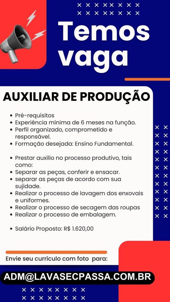 Empresa está selecionando Auxiliar de produção; Envie seu currículo!